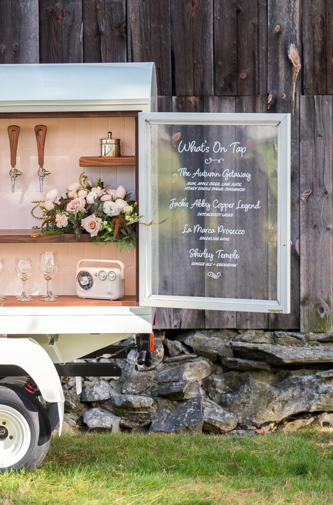 The Getaway Bar is a “dry hire” bar. It’s not because we don’t love a good cocktail (trust us, we do). But in most states today—including Massachusetts—mobile bars and bartenders can’t get a liquor license unless they: A) Have a catering license (cooking is not our jam) or B) have a brick-and-mortar home (our little Piaggio isn’t looking to settle down anytime soon!). The upside? You avoid inflated bar markups and get to keep the leftovers. Oh, and don’t stress about the details—we’ll guide you on exactly what and how much to buy so your taps don’t run dry and your guests don’t go thirsty.